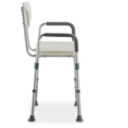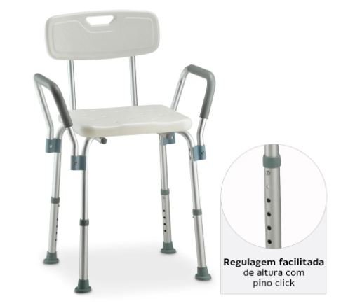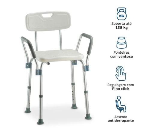 Ideal para adultos e idosos com limitações de movimentos e que necessitam de segurança no banho, o Banco para Banho D3 Dellamed possui corpo de alumínio anodizado e assento ergonômico com aberturas para escoar a água. O banco também conta com encosto, apoio de braços, ponteiras de borrachas com ventosas para fixação no chão, além de seis níveis de regulagem de altura de engate rápido por pino click, proporcionando um ajuste de 43,5 a 56 cm de altura.