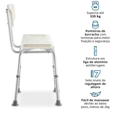 Ideal para adultos e idosos com limitações de movimentos e que necessitam de segurança no banho, o Banco para Banho D2 Dellamed possui corpo de alumínio anodizado e assento curvo ergonômico com encaixe de mãos e aberturas para escoar a água. Conta com encosto, ponteiras de borrachas com ventosas para fixação no chão, além de sete níveis de regulagem de altura de engate rápido por pino click, proporcionando um ajuste de 39 a 54 cm de altura.