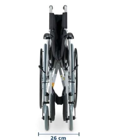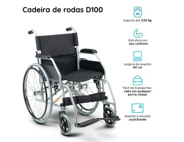 Seu design apresenta um chassi tubular de aço carbono com revestimento epóxi, proporcionando uma estrutura robusta e altamente resistente à umidade. Além disso, a cadeira de rodas D100 possui uma estrutura dobrável, equipada com o sistema em duplo X, garantindo praticidade no transporte e armazenamento.