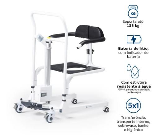 A Cadeira de Transferência D80 Dellamed é uma solução versátil e resistente, especialmente projetada para atender às necessidades de pessoas com mobilidade reduzida. Com capacidade para suportar até 135 kg, esta cadeira apresenta um sistema de elevação eletrônica que facilita a transferência do usuário entre diferentes locais. Além disso, ela é um verdadeiro 3 em 1, desempenhando as funções de cadeira de transferência, cadeira de transporte interno e sobre vaso, oferecendo praticidade e conforto em diversas situações. Equipada com rodas com trava, proporciona segurança e estabilidade durante o uso, especialmente para acamados e cadeirantes. Este modelo de cadeira eletrônica conta com a classificação IP44, garantindo proteção contra respingos de água e assegurando durabilidade e segurança em ambientes úmidos.