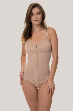 A cinta modeladora pós-cirúrgica modelo body sem pernas tem abertura frontal e fechamento com colchetes, é indicado para cirurgia plástica como: abdominoplastia, lipoaspiração, mamoplastia com prótese de silicone ou redutora e lipo de culotes e flancos.