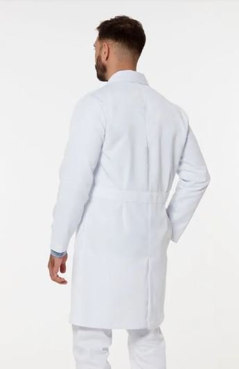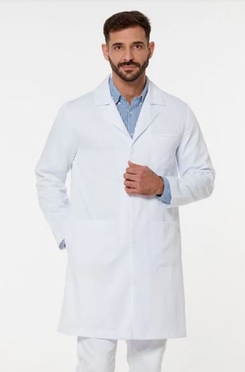 Jaleco masculino modelo tradicional, com bolso frontal e lateral.