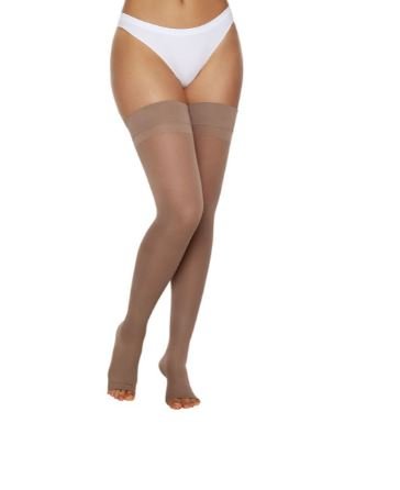 A Meia 7/8 sem ponteira (20-30 mmHg) tem compressão graduada, o que significa que a maior compressão está concentrada no tornozelo e vai decrescendo gradativamente até a altura da coxa. Essa compressão facilita o retorno do sangue dos membros inferiores ao coração.